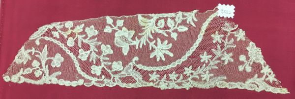 Volant de dentelle de Bruxelles aux fuseaux à pièces rapportées, deuxième moitié du XVIIIe siècle, fond drochel, décor composé de frises de perles disposées en oblique en parallèle de tiges feuillagées, de motifs végétaux disposés en bordure inférieure et de branches naissant de la bordure supérieure, motifs travaillés en toilé serré avec un ramassage de fils sur les côtés formant un léger relief, bord inférieur picoté et légèrement festonné.