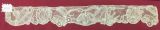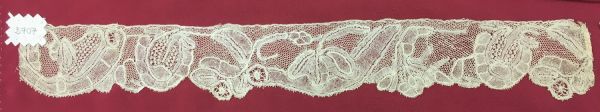 Volant de dentelle de Bruxelles aux fuseaux à pièces rapportées, fond drochel, décoré de fleurs stylisées tombantes et de grosses feuilles, motifs travaillés en toilé serré avec un ramassage de fils sur les côtés formant un léger relief, bord inférieur festonné et picoté.