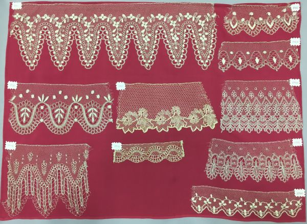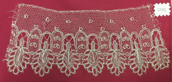 Volant de dentelle aux fuseaux à fils continus, XIXe ou XXe siècle, réseau de mailles à fils croisés, décor composé d’une rangée de feuilles renversées surmontées d’un lacet sinueux délimitant des compartiments verticaux abritant chacun deux fleurs, surmonté de deux rangées de pois ajourés, motifs cernés par un cordonnet, bord inférieur festonné et picoté.