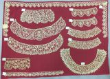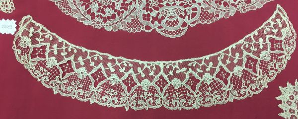 Col en dentelle à l’aiguille, XIXe ou XXe siècle, décoré partie basse de cartouches feuillagés formés de volutes dont la partie basse forme un alignement de losanges alternant avec des fleurs stylisées d’où partent des rinceaux feuillagés se déployant jusqu’en bordure supérieure sur un réseau mécanique, bords extérieurs festonnés.