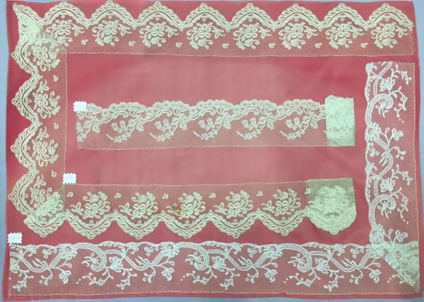 Volant de dentelle de Valenciennes aux fuseaux à fils coupés, décoré en partie inférieure d'une guirlande de fleurs d’où partent des rinceaux feuillagés et fleuris stylisés, alternant avec des volutes, motifs travaillés en toilé serré et uniforme, réseau de mailles carrées tressées sur tous les cotés, bord inférieur festonné et picoté.