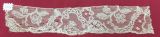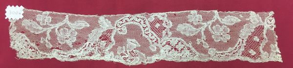 Volant de dentelle de type Malines aux fuseaux à fils continus, fond de glace, XVIIIe ou XIXe siècle, décoré en bordure inférieure de motifs végétaux d’où partent des rinceaux parallèle disposés de biais entre lesquels pendent des branches feuillagées et fleuries, motifs travaillés en toilé fin et cernés par un cordonnet, réseau de mailles à quatre fils croisés trois fois sur les deux côtés parallèles à la lisière, bord inférieur picoté et légèrement festonné.