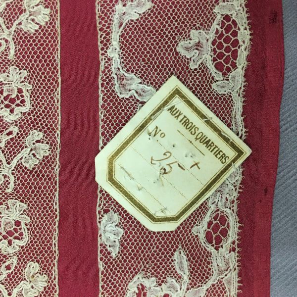 - Numéro donné par l'atelier conservatoire du Puy en Velay : 3085 (écrit à l'encre noire sur une étiquette en toile de coton blanc).