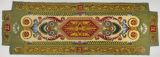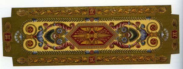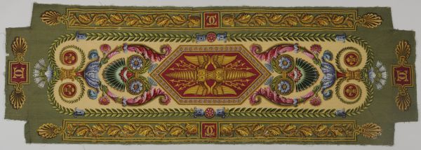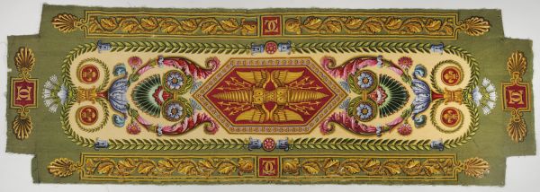 Un dessus de banquette en tapisserie de Beauvais fond jaune et vert. Milieu à caisson hexagone, le centre à foudre jaune deux tons sur fond rouge, entourage à fleurons sur fond lilas, culots, rinceaux, ornements coloriés, palmettes et arabesques sur fond jaune, petites médailles à fleurs de lys sur fond rouge, plate-bandes à courant de feuilles de chêne, palmettes et listels jaunes deux tons sur fond vert, chiffres double C sur fond rouge.