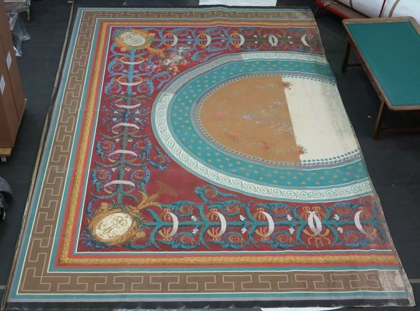 Modèle de tapis en toile peinte établi par Chabal-Dussurgey, artiste peintre. Milieu à médaillon demi ovale bordure d’entourage à rubans, semé d’abeilles et ornements, grand encadrement à feuillages, couronnes, corbeille de fleurs et arabesques, aux angles un écusson avec le chiffre de l'impératrice Eugénie, bordure d’encadrement dessin grec à talon de laurier. Sans destination connue.