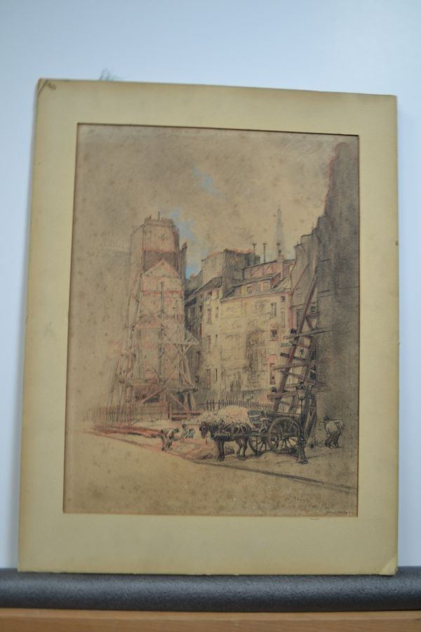 Vue, depuis le Petit-Pont, de la place du Petit-Pont. Le clocher de Saint-Séverin apparaît à l'arrière-plan. Au premier plan, des ouvriers consolident le mur de refends d'un immeuble.