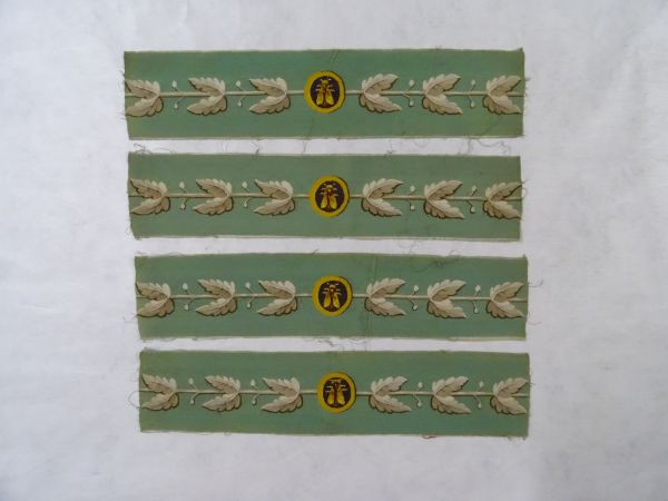 Guirlandes de feuilles de chêne et baies grisaille de part et d'autre d'un petit médaillon jaune à décor d'abeille sur fond violet, le tout sur fond vert d'eau.