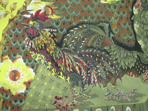 Un coq et une poule marchent sur une table nappée de blanc. De cet espace rond central rayonnent des feuillages d'automne sur fond jaune. La composition est cadrée par une bordure irrégulière formée de feuilles, d'herbes, d'insectes.