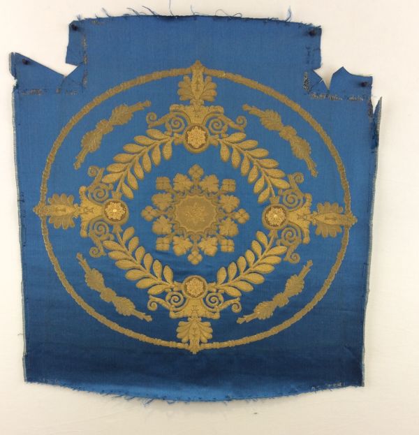 Dépècement de fauteuil de représentation, sans doute assise. Pièce de tissu de section carré. Les deux lisières sont encore présentes bien que lacunaires. Le bord inférieur est légèrement arrondi. Brocart en 4 ors, filé, frisé, lamé et or en cannetille imitation de broderie, fond satin bleu n°3 avec liseré de soie.
