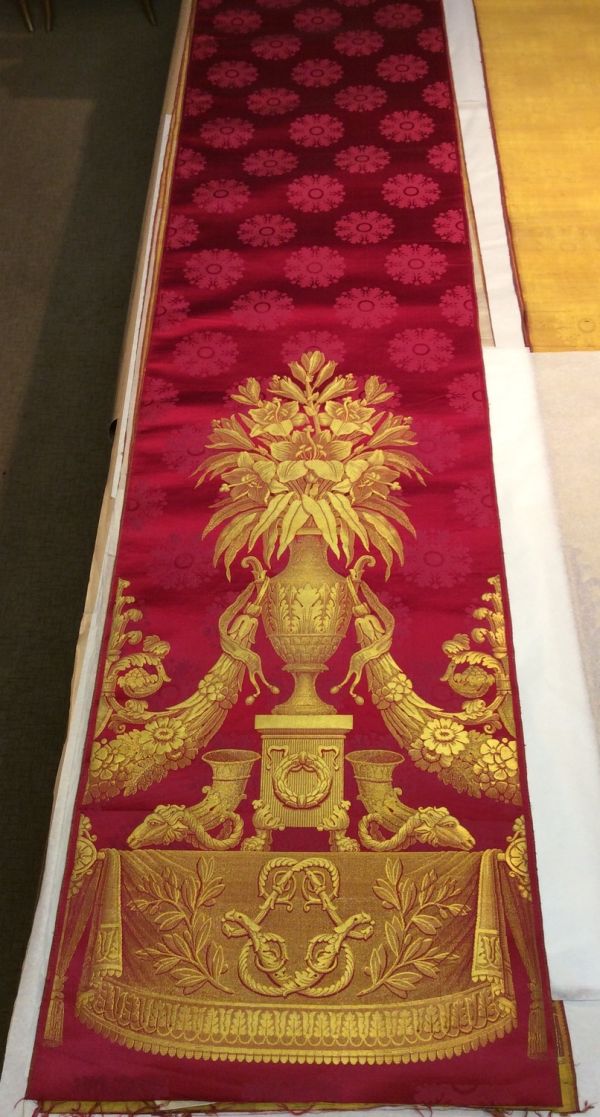 Lé de lampas taille douce broché rouge. Lé complet avec ses deux lisières. Fond satin cramoisi, semé de rosaces formées de feuilles et glands de chêne ton sur ton. Soie, filés or. Décor de vase contenant un bouquet de lys, sur une table couverte d’une nappe avec le chiffre de Louis XVIII, deux L majuscules en miroir et entrelacés. Deux guirlandes florales partent des anses du vase et deux rhytons à tête de bélier sont placés de profil à ses pieds.
