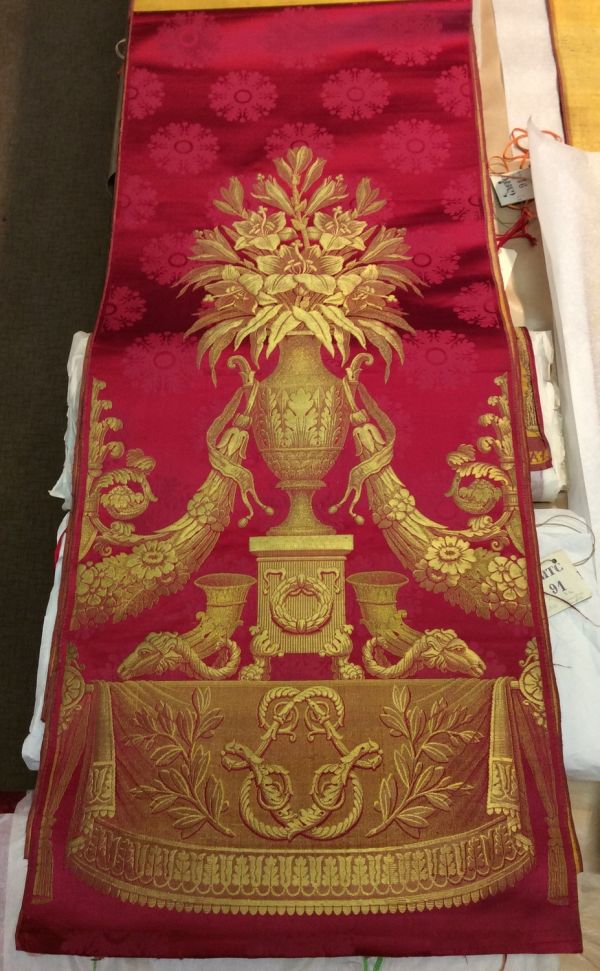Lé de lampas taille douce broché rouge. Lé complet avec ses deux lisières. Fond satin cramoisi, semé de rosaces formées de feuilles et glands de chêne ton sur ton. Soie, filés or. Décor de vase contenant un bouquet de lys, sur une table couverte d’une nappe avec le chiffre de Louis XVIII, deux L majuscules en miroir et entrelacés. Deux guirlandes florales partent des anses du vase et deux rhytons à tête de bélier sont placés de profil à ses pieds.