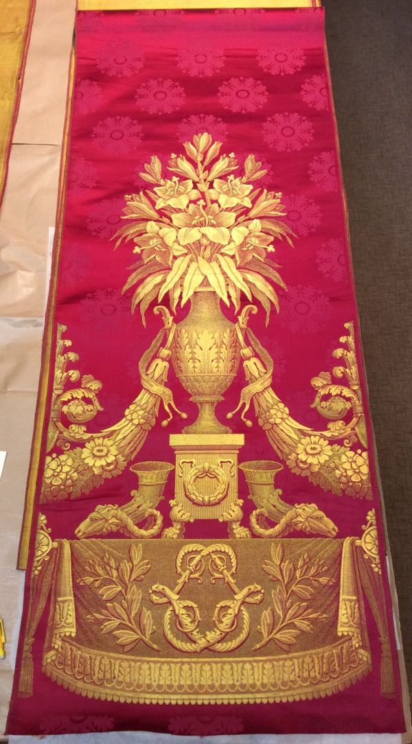 Lé de lampas taille douce broché rouge. Lé complet avec ses deux lisières. Fond satin cramoisi, semé de rosaces formées de feuilles et glands de chêne ton sur ton. Soie, filés or. Décor de vase contenant un bouquet de lys, sur une table couverte d’une nappe avec le chiffre de Louis XVIII, deux L majuscules en miroir et entrelacés. Deux guirlandes florales partent des anses du vase et deux rhytons à tête de bélier sont placés de profil à ses pieds.
