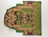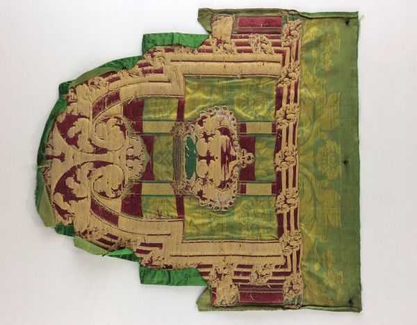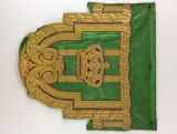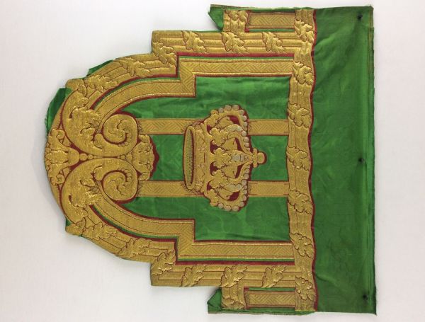 Dent de lambrequin. Présence de deux lisières sur les bords latéraux partiellement repliées. Le long des bordures latérales, au niveau du décrochement le plus haut, une partie du satin, au delà des bandes décoratives n'est pas repliée au revers. En partie inférieure, le satin est partielement replié et cousu au revers pour former la dent du lambrequin.