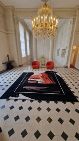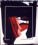 Dans un fond à dominante noir s'inscrit un rectangle blanc contenant une forme rouge
