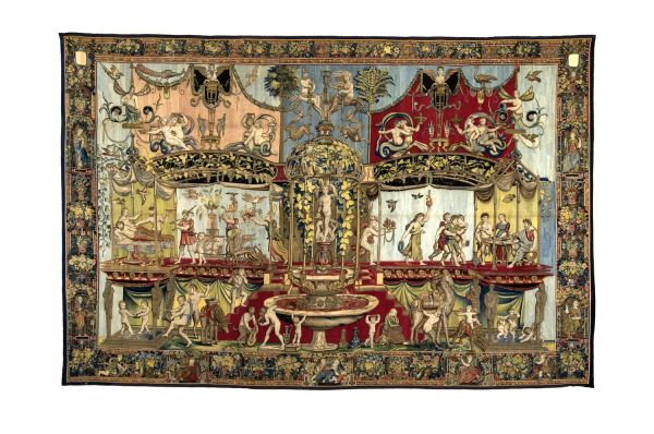 Bacchus est représenté sous un arceau décoré de pampres et de vignes, couronné de raisins. Il se tient debout au sommet de deux vasques pleines de vin où viennent puiser des enfants nus. De chaque côté, des scènes bachiques divisées en trois registres superposés. Bordures formées de feuillages avec représentation des Vertus.