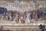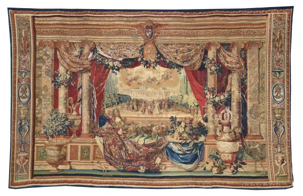 En avant de la colonnade du Louvre, un théâtre sur lequel se joue un opéra. Des nuages, garnis de dieux et de déesses, se voient au dessus de la colonnade. En bas, les spectateurs. A gauche, deux valets portant la nef du Roi. De chaque côté, le sujet est limité par deux colonnades soutenant des draperies et des guirlandes de fleurs. Sur la balustrade qui occupe le devant, est étalé un riche tapis doré et posé un plat couvert de fruits. A gauche, une caisse d'argent avec un oranger en fleur et un petit chien. A droite, un grand vase à trois anses et un oiseau au col allongé. Un singe au milieu. Bordure d'un entablement dans le haut, avec armes de France au milieu et, au-dessous, le signe du mois. Sur les côtés, cerf assis, grotesques, chiffres du Roi dans un médaillon à mi-hauteur.