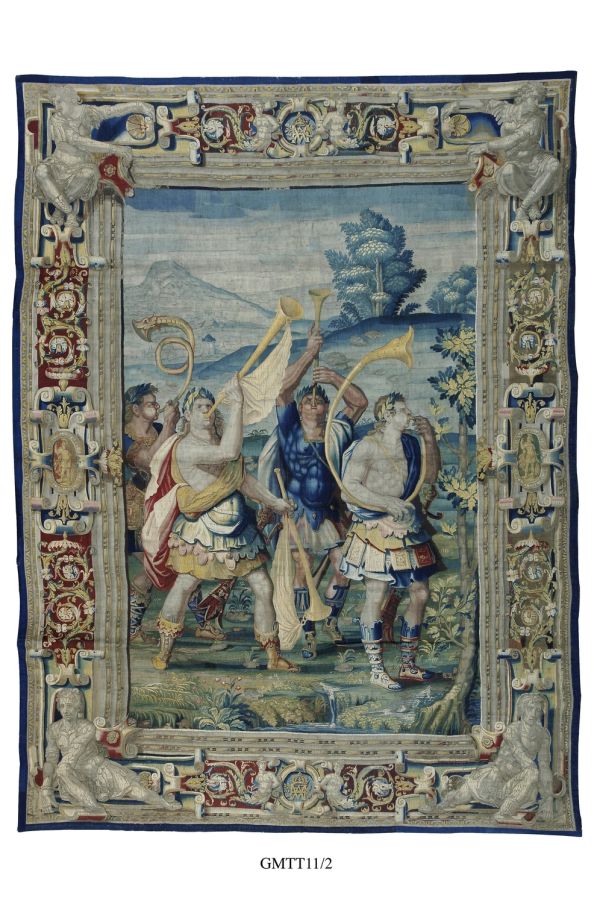 La composition représente quatre hommes à pied, couronnés de lauriers, qui sonnent du buccin. La bordure est composée de rinceaux sur fond brun interrompus au milieu par des cartouches portant, dans les bordures horizontales les chiffres HM enlacés, et dans les bordures latérales des guerriers en camaïeu. Au milieu de la bordure supérieure sont représentées les armes de France et de Navarre soutenues par quatre anges de grisaille et aux quatre coins, des guerriers en grisaille.
