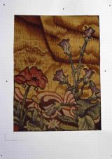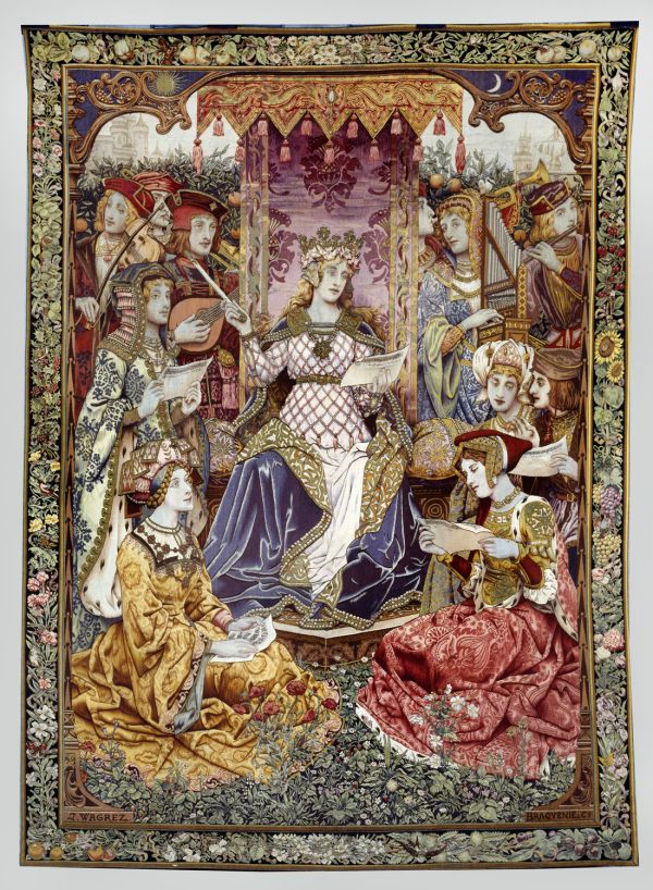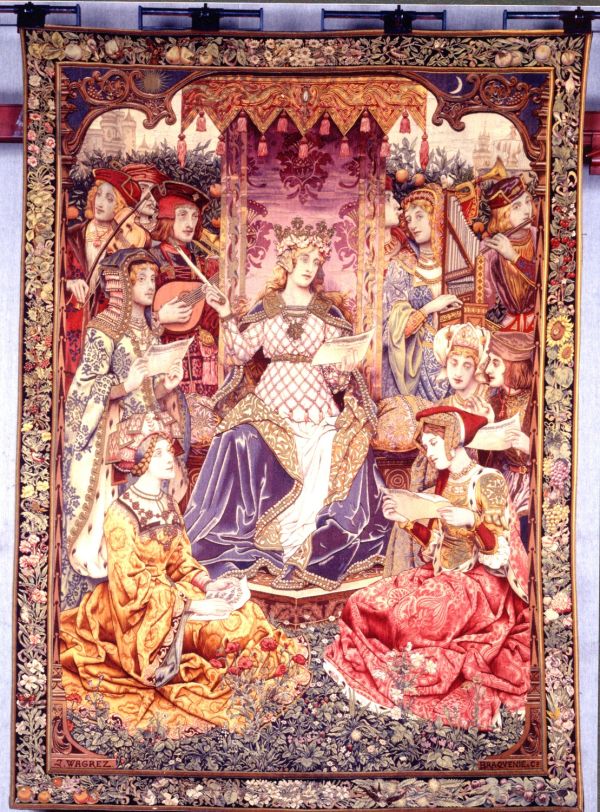 Bordure avec fruits et fleurs, au centre allégorie de la musique reprèsentèe par une figure féminine assise sous un dai entourée de 10 personnages jouants de divers instruments dans un jardin, les personnages sont en costumes du dèbut du XVIe siècle.