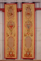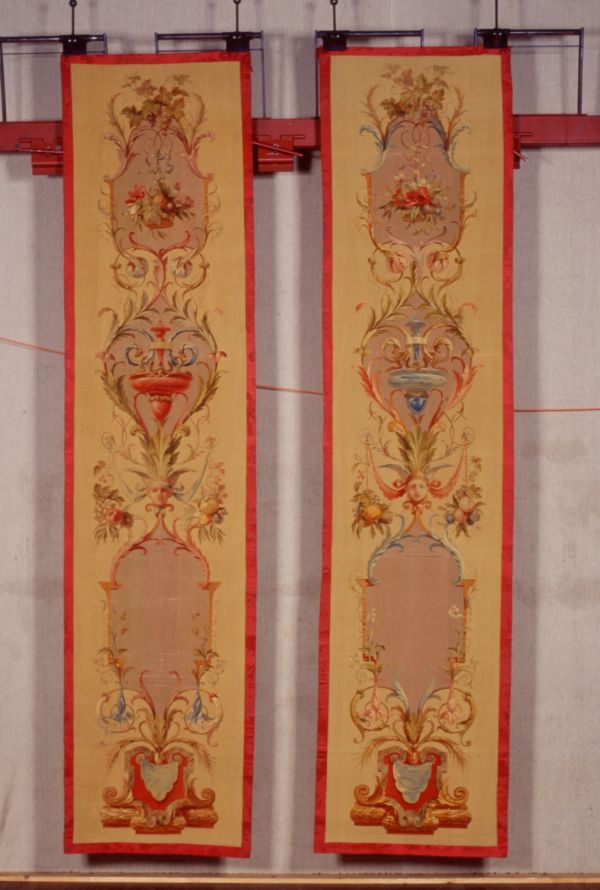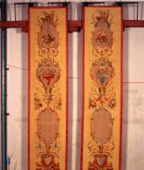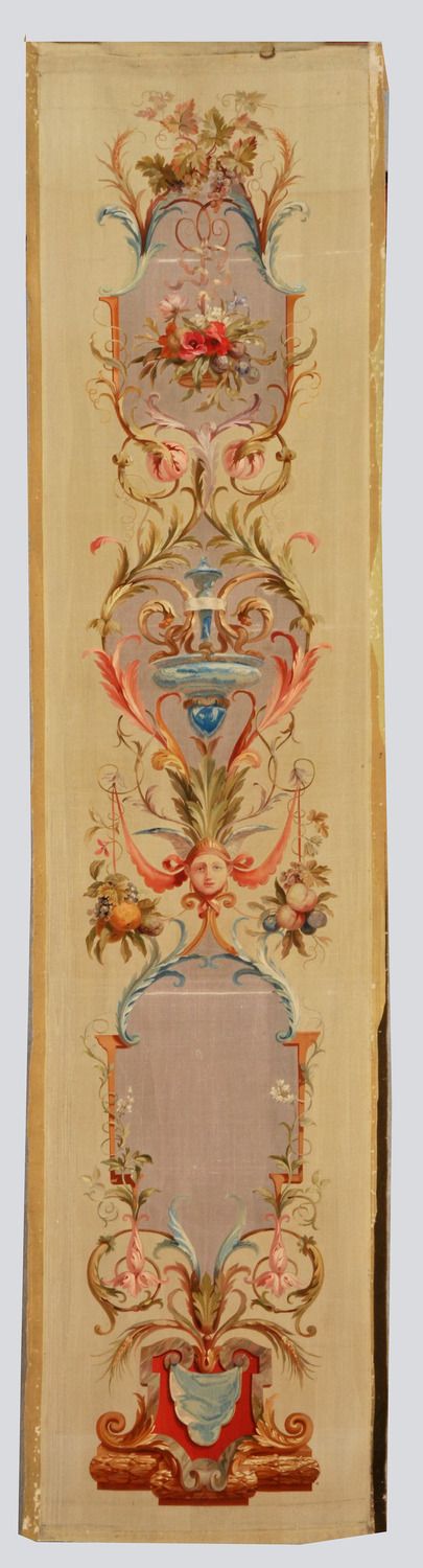 Au bas de la composition une sorte de piedestal tripode avec draperie bleue sur fond rouge il est surmonté de trois cartouches lilas pris dans des rinceaux fleuris : Le premier est uni et surmonté d'un masque féminin ailé flanqué de draperies roses et de fruits en chutes, le second est avec vase bleu, le troisième prèsente un panier de fleurs.