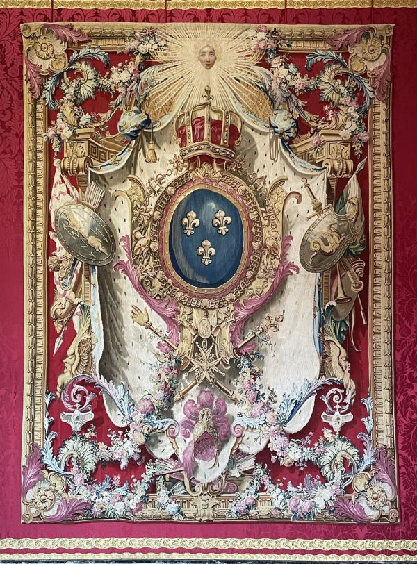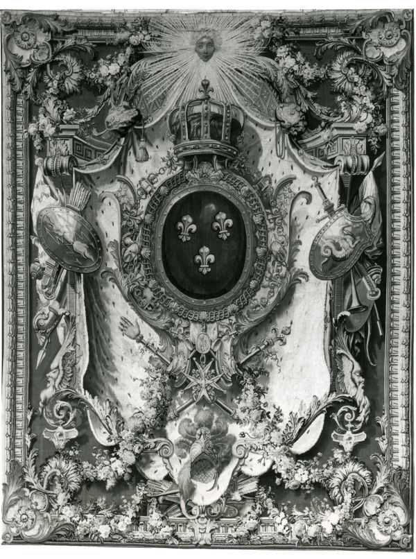 Sur un fond rouge vif, un écusson ovale aux trois fleurs de lys, surmonté de la couronne royale, entouré des colliers de Saint-Michel, se détache sur un manteau d'hermine. Au-dessus de l'écusson, le sceptre et la main de justice croisés surmontent un heaume à panache violet. Soleil au-dessus de la couronne. Trophées et fleurs aux angles et sur les côtés. Trophées d'armes de chaque côté de l'écu de France, recouverts d'un bouclier avec un foudre sur le bouclier de droite et un dragon sur celui de gauche. Encadrement de moulures imitant le bronze doré. Ecoinçon ornés de feuilles roses et violettes.
