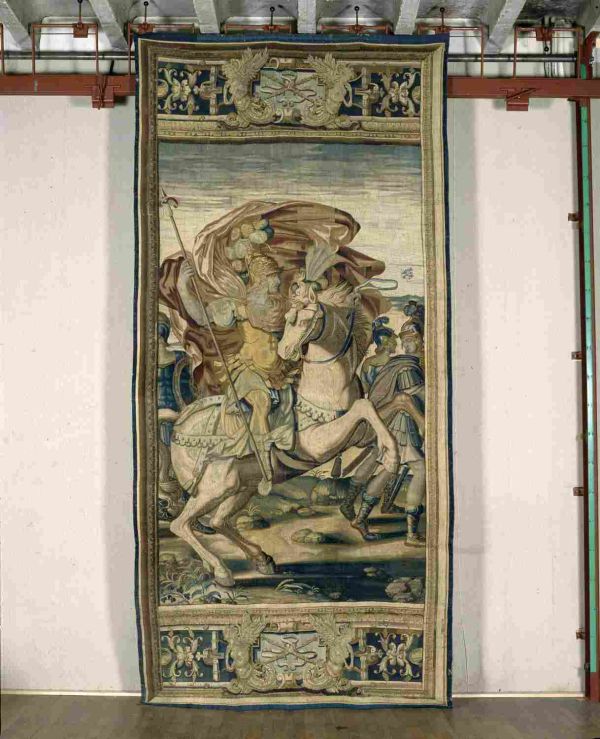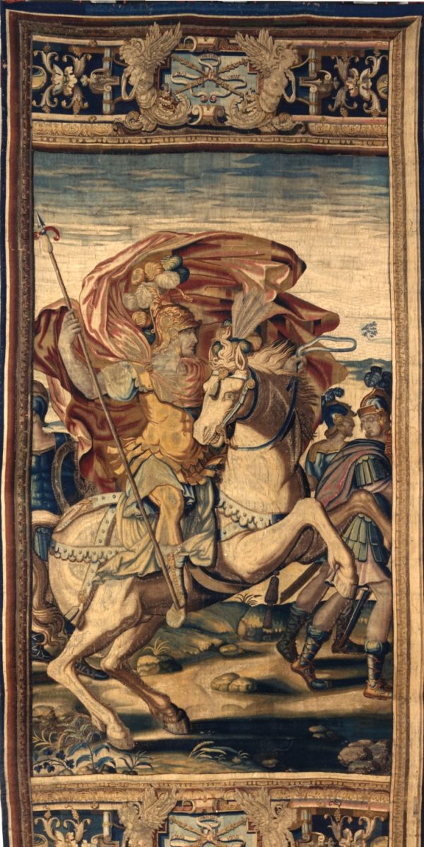 Coriolan est représenté sur sa monture, la lance dans la main gauche posée sur le pied. Il se dirige vers la droite, son manteau gonflé par le vent. Quelques soldats à l'arrière-plan. Bordure à cartouches sur fond brun. Huit pièces portent des cartouches à fond d'or avec grisailles. Sur quatre, aux quatre coins, un fond rouge avec des mufles de lion, et quatre dans les milieux, un fond bleu avec des H, deux sceptres et une épée croisés. La banderole qui attache les sceptres en sautoir porte la devise Duo protegit unus.