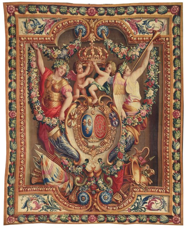 Les armes de France et de Navarre dans un écusson central, soutenues par une Renommée et une Flore, dans une bordure couleur de bronze doré, avec des oves et un feston de feuilles de laurier qui règne autour, attaché à un cordon jaune et rouge.