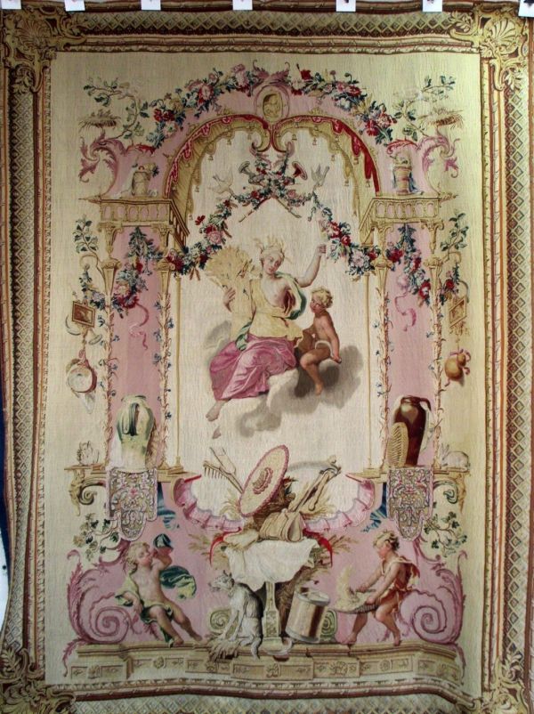 Au milieu, Cérès, sur des nuages, supporte une gerbe de blé dans le bras droit et un flambeau dans la main gauche. A côté d'elle, à droite, un enfant nu tient une faucille. Au bas de la composition, de chaque côté d'un trophée d'instruments d'agriculture, à droite, un enfant vanne du blé, et, à gauche, un enfant boit à une bouteille, à côté d'un chien assis qui le regarde. Sur les consoles, à droite, un vase de grès, une vannerie, un lapin de face ; à gauche, un autre vase et un lapin de profil. Au-dessus des colonnettes sont posés deux paniers garnis. Sous le portique deux oiseaux tiennent par le bec une guirlande de fleurs, nouée au centre autour de deux instruments de musique. En haut, guirlandes de fleurs, nids d'oiseaux et, au milieu, le signe du Lion. De chaque côté des colonnettes, une chute de divers objets avec le signe du Cancer à gauche et le signe de la Vierge à droite.