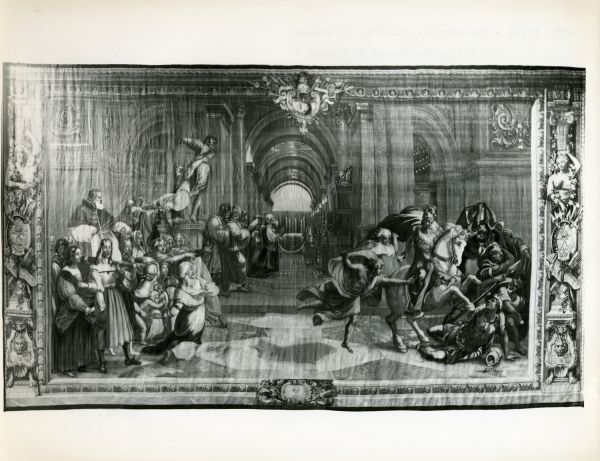 Déposée en 1913 au palais de l’Élysée (jardin d'hiver). Classée au titre des Monuments historiques le 20 janvier 1923, avec quarante et une autre pièces des différents tissages de la tenture des Chambres du Vatican, d'après Raphaël (GMTT 173 à 182) (PM75002424). De retour au Mobilier national en 1984.