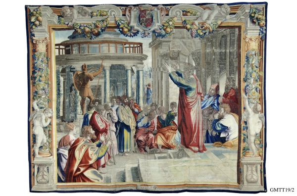 En 1923 au Mobilier national. Classée au titre des Monuments historiques le 20 janvier 1923, au sein d'un ensemble de huit pièces de la tenture des Actes des Apôtres, d'après Raphaël (GMTT 17 et 19) (PM75002386).