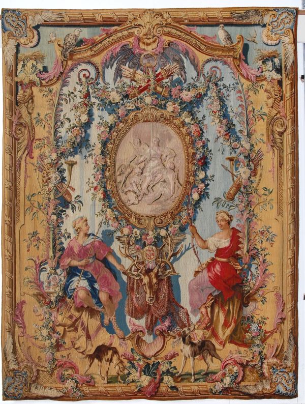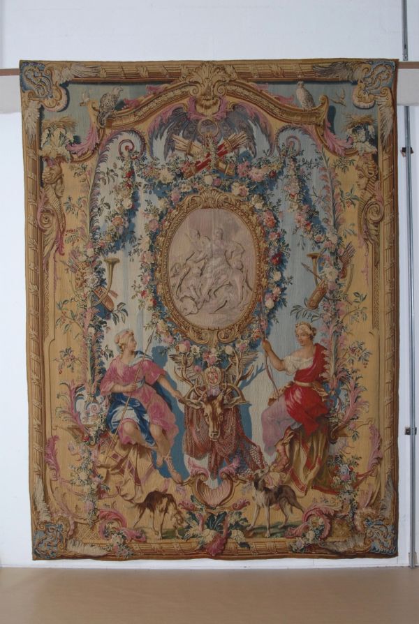 D'une suite de quatre portières achetées par Stanislas Leczinski, roi de Pologne. Les armes du roi de France sont remplacées par celles du roi de Pologne par Audran qui rajoute par dessus la tête de cerf.