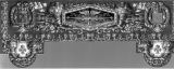 Au centre : 3 médaillons aux armoiries royales dorées sur fond bleu reposant sur des poteaux ornés de fleurs de lys et d'une base avec un bouclier au fond bleu et tête de lion blanche.