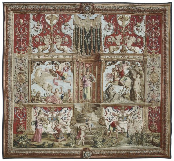 Minerve, casquée, est représentée debout dans la niche centrale, sur un piédestal. Au-dessous d'elle, deux enfants jouent avec une chauve-souris sur les marches du piédestal. En haut à gauche: Persée coupant la tête de Méduse. A droite : Persée et Andromède. En bas à gauche : Minerve donnant l'égide à Persée ; à droite, Persée tenant la tête de la Gorgone, et deux femmes au bain. Grotesques, rinceaux. Bordure de feuilles et guillochis de couleur bronze doré sur fond bleu. Armes de France dans la bordure supérieure, chiffres du roi dans la bordure inférieure.