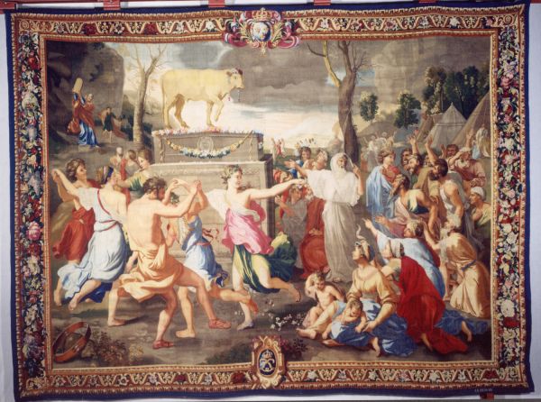 Les Hébreux dansent devant le Veau d'or placé à gauche dans la composition. A droite, un grand prêtre vêtu de blanc et de nombreux spectateurs. Au premier plan, à droite, une femme assise et deux enfants. Au fond, à droite, les tentes du camp ; à gauche, Moïse, sur une éminence, brise les Tables de la Loi.