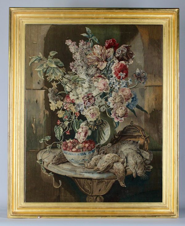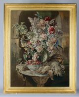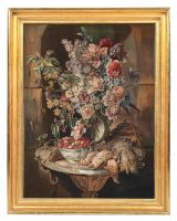 Fruits et vase de fleurs, gibier