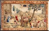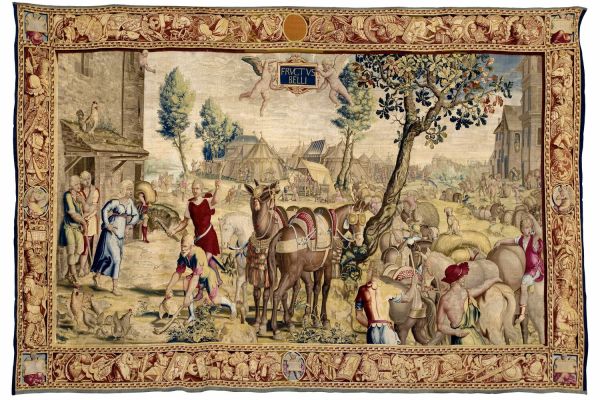 En 1923 au Mobilier national. Classée au titre des Monuments historiques le 20 janvier 1923, au sein d'un ensemble de neuf pièces issues de deux tissages de la tenture des Fruits de la guerre, d'après Jules Romain (GMTT 38 et 39) (PM75002393).