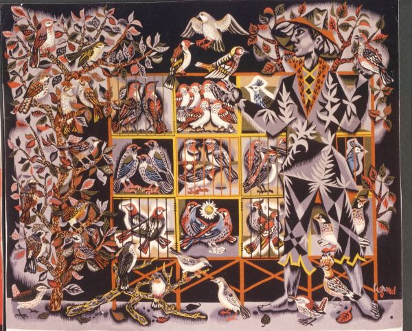 Sur la droite un personnage en grisaille, debout, présentant des oiseaux devant une cage à 12 compartiments, chacun avec oiseaux différents - ayant à sa gauche, en pendant, un petit arbre garni sur ses branches dfoiseaux divers et multicolores, sur fond gris et noir - au sol, branches d'arbres, au bas des supports de la cage avec oiseaux