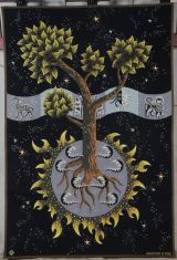 Un arbre à trois branches dont les racines apparentes reposent sur un cercle entouré de flammes. Une banderole, décorée de signes du zodiaque, ondule sur un fond noir à petits flocons gris parsemé de quelques étoiles blanches.