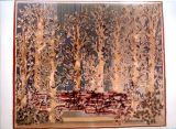 Une forêt d'arbres de tonalité beige à feuillages colorés se détachent sur un fond finement rayé verticalement vert et bleu.