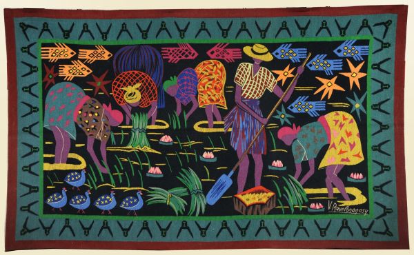Sur un fond noir, se détachent des femmes indigènes les pieds dans la rizière en train de repiquer le riz. Bordure à dessins noirs sur fond vert, entre deux listels vert et brun rouge.