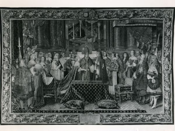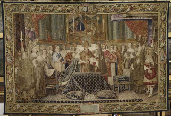 En place en 1923 au château de Versailles. Classée au titre des Monuments historiques le 20 janvier 1923, au sein d'un ensemble de trente-sept pièces tirées des différents tissages de l'Histoire du roi (GMTT 95, 98, 99, 100, 101) (PM75002406). En 1950 dans le salon de la Reine. Restée depuis au château de Versailles.