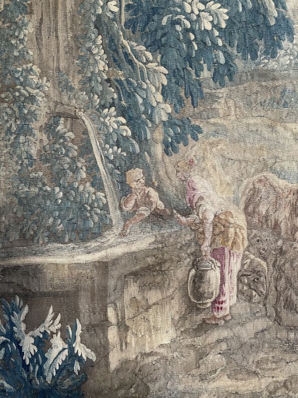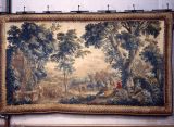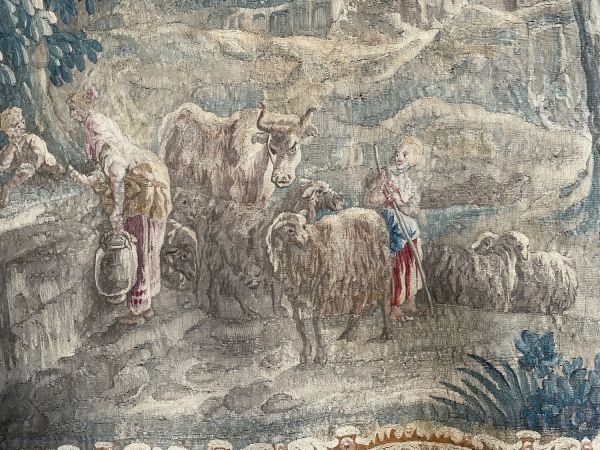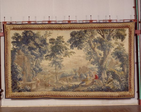 Verdure. Laine et soie. Dans un paysage champêtre ombagé de grands arbres, deux bergères et un bergé se reposent à droite sur un talus. A gauche des femmes puisent de l'eau à un abreuvoir vers lequel une bergère conduit son troupeau. Bordure imitant un cadre doré.