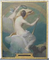 Une femme nue vue de dos tenant à la main une longue trompette un amour la couronnant. Dans le fond un arc en ciel se détache du ciel. Inscription "Renaissance"