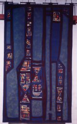 Sur fond brun foncé de grandes verticales vertes et bleues montant vers le ciel en un parallélisme qui n'en limite pas l'envol symbolisant une multitude d'oraisons s' élevant de concert.
