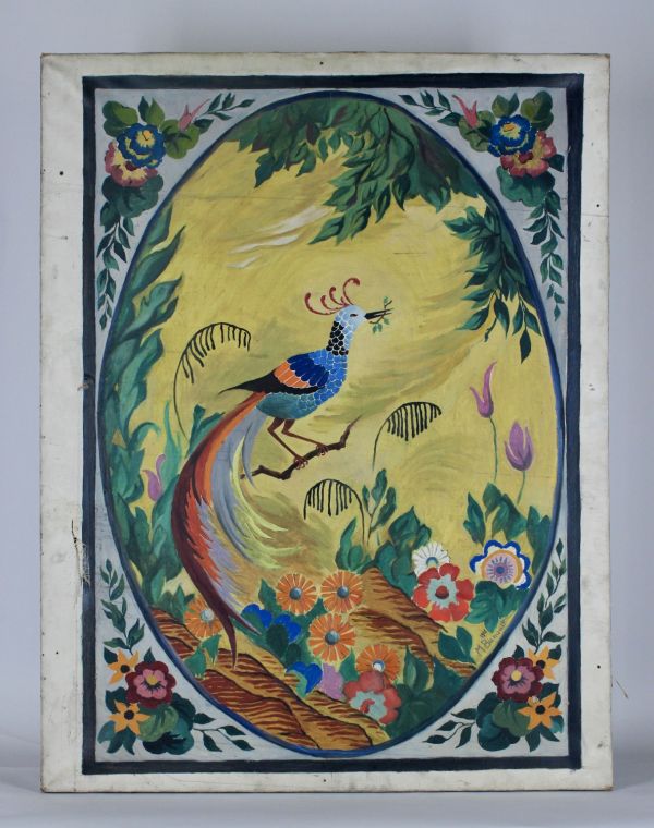 Dans un rectangle dont les angles sont ornés d'un bouquet de fleurs, s'inscrit un ovale où tône un paradisier au milieu d'un paysage avec de grosses fleurs multicolores.