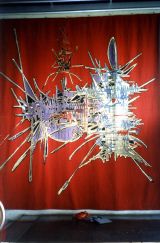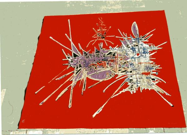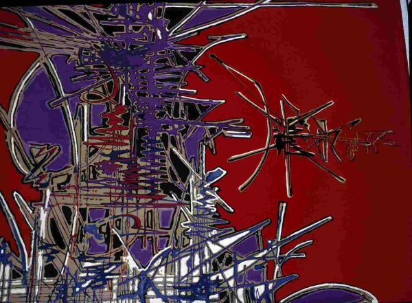 Sur un fond rouge foncé se détache un grand motif stylisé à fond jaune, vert et blanc dont des lignes rouges, bleues et mauves. A la partie supérieure un motif en hauteur noir et jaune.