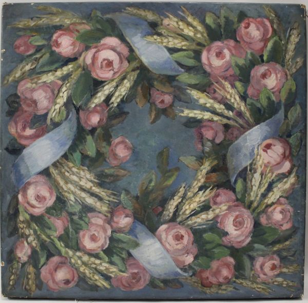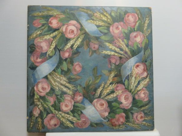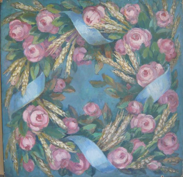 Sur un fond bleu se détachent des fleurs roses, des épis de blé et des rubans.