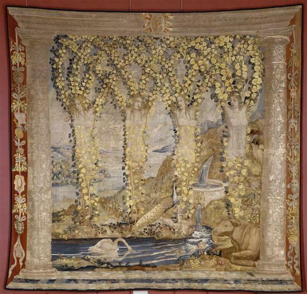 Quatre nymphes dont les corps sortent de terre en arbres, lèvent les bras qui se terminent en branches de peupliers, formant arceaux. En bas, eau courante fournie par une cascade.