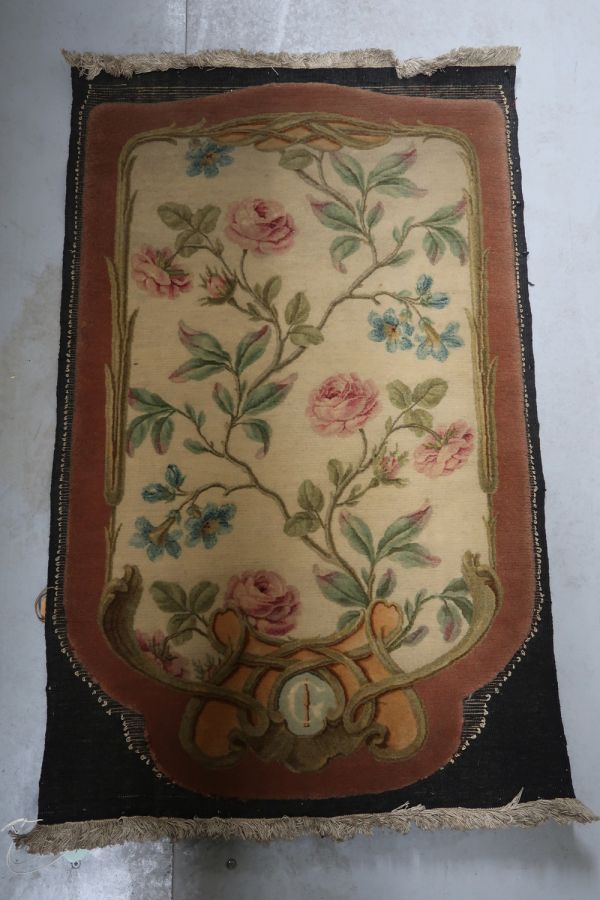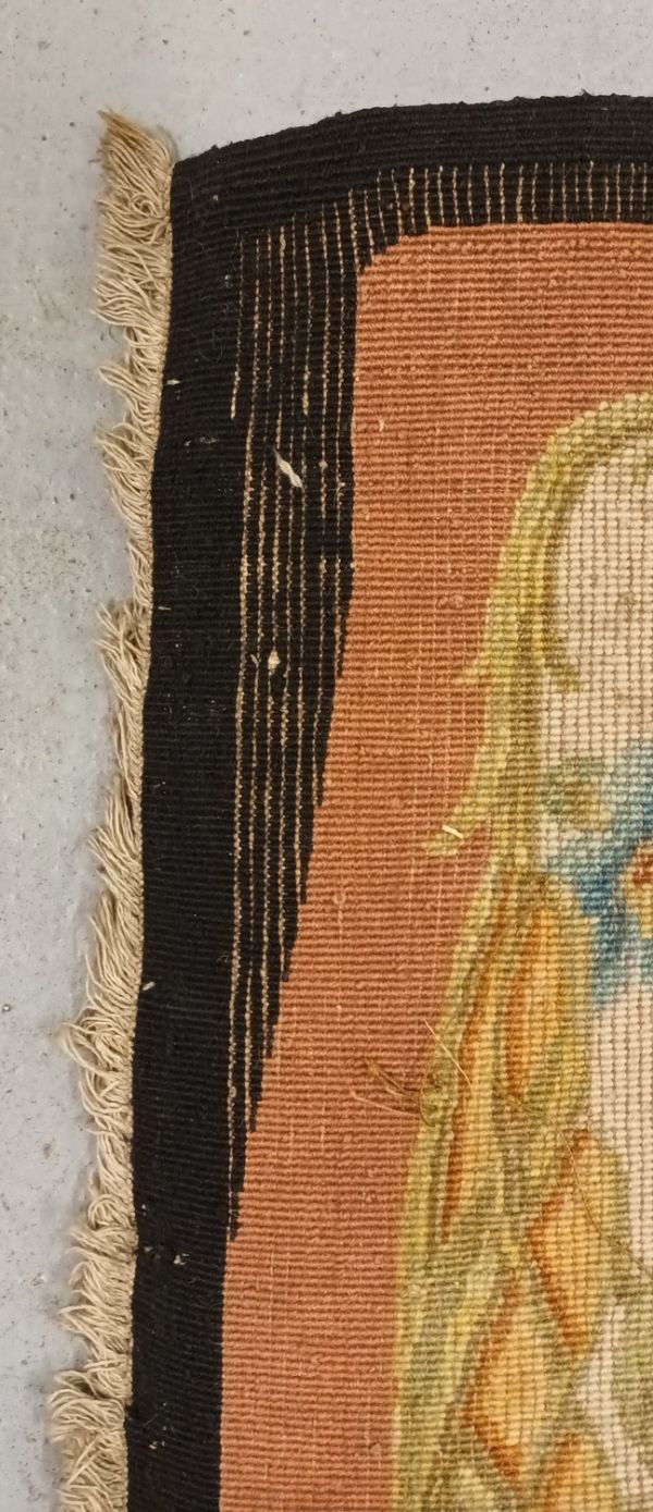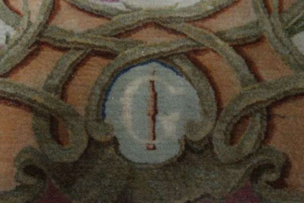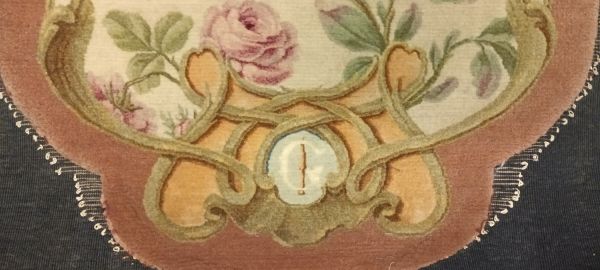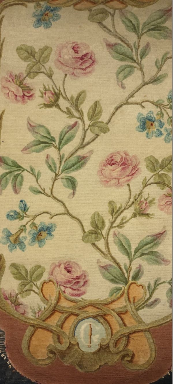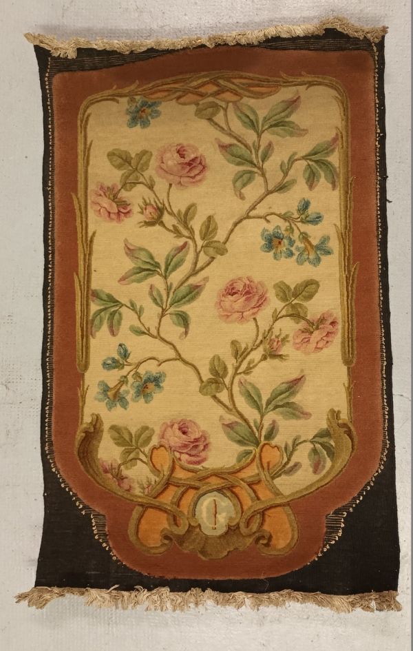 Etiquette rapportée ancienne manuscrite "GOB 1319 Feuille d'écran en / Savonnerie des Gobelins d'après / Jacques 1876 / Haut. 85 x 54 / 60000" et verso imprimé "LES MANUFACTURES NATIONALES / ET / ATELIERS D'ART DE L'ETAT FRANCAIS / MANUFACTURE NATle DE SEVRES / TAPISSERIES ET SAVONNERIE DES / GOBELINS - TAPISSERIES DE BEAUVAIS / & AUBUSSON - MOULAGES & GRAVURES / DU LOUVRE - MEDAILLES DE LA MONNAIE"