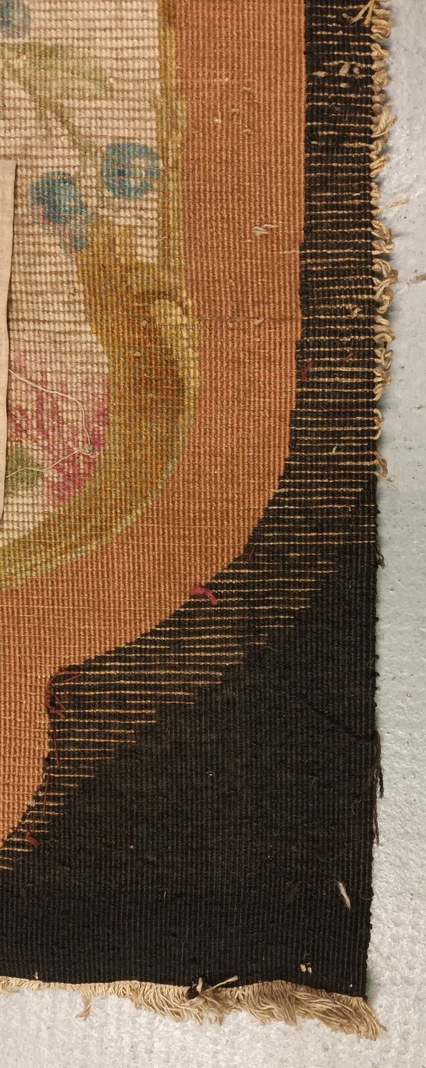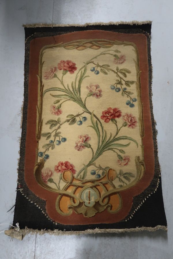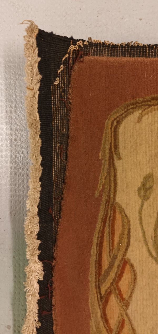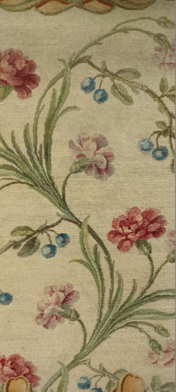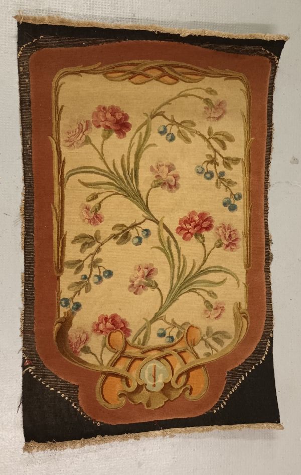 Motif central de branches à à feuillages verts et pointes mauves portant des fleurs roses et bleues encadré par une tige de lys sans fleurs qui remonte le long du caisson. Le sommet est chantourné en doucine tandis que la base est en trois arcs dont celui central est en anse de panier. Le tout est entouré d'une bordure vieux rose puise d'une lisière tissé noir.