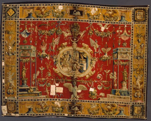 Les motifs de grotesques sont répandus sur l'ensemble de la tapisserie, ornée des armes de Claude de La Châtre de La Maisonfort (1536-1614) et de son épouse, Jeanne Chabot.